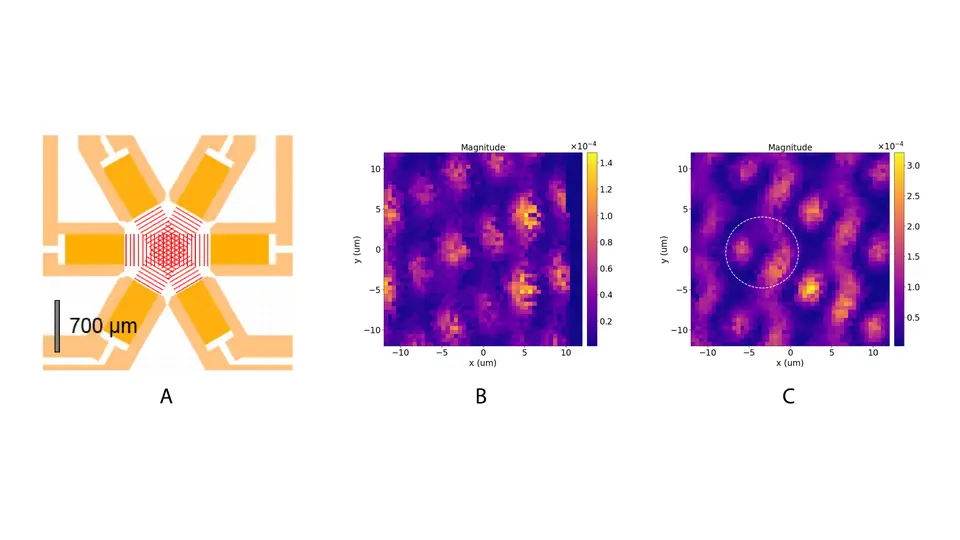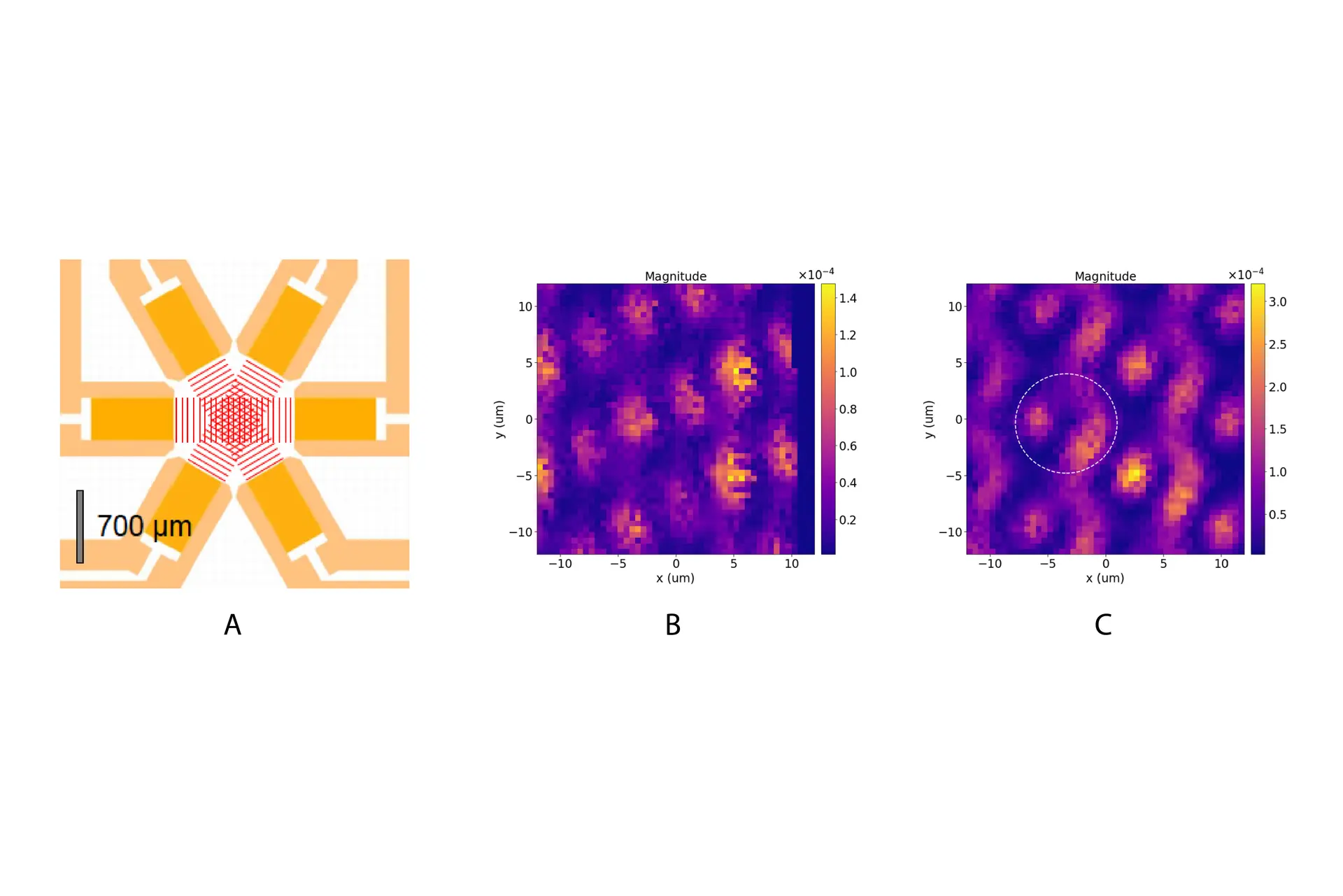 - Fig. C: The spatial map of the measured amplitude of the transmissive scattering parameter |S21|. Three pairs of IDTs are excited with 120 degree phase difference between each pair. delay. This creates an array of vortices on the sample surface. A white dashed circle is added as a reference to indicate the formed vortex.