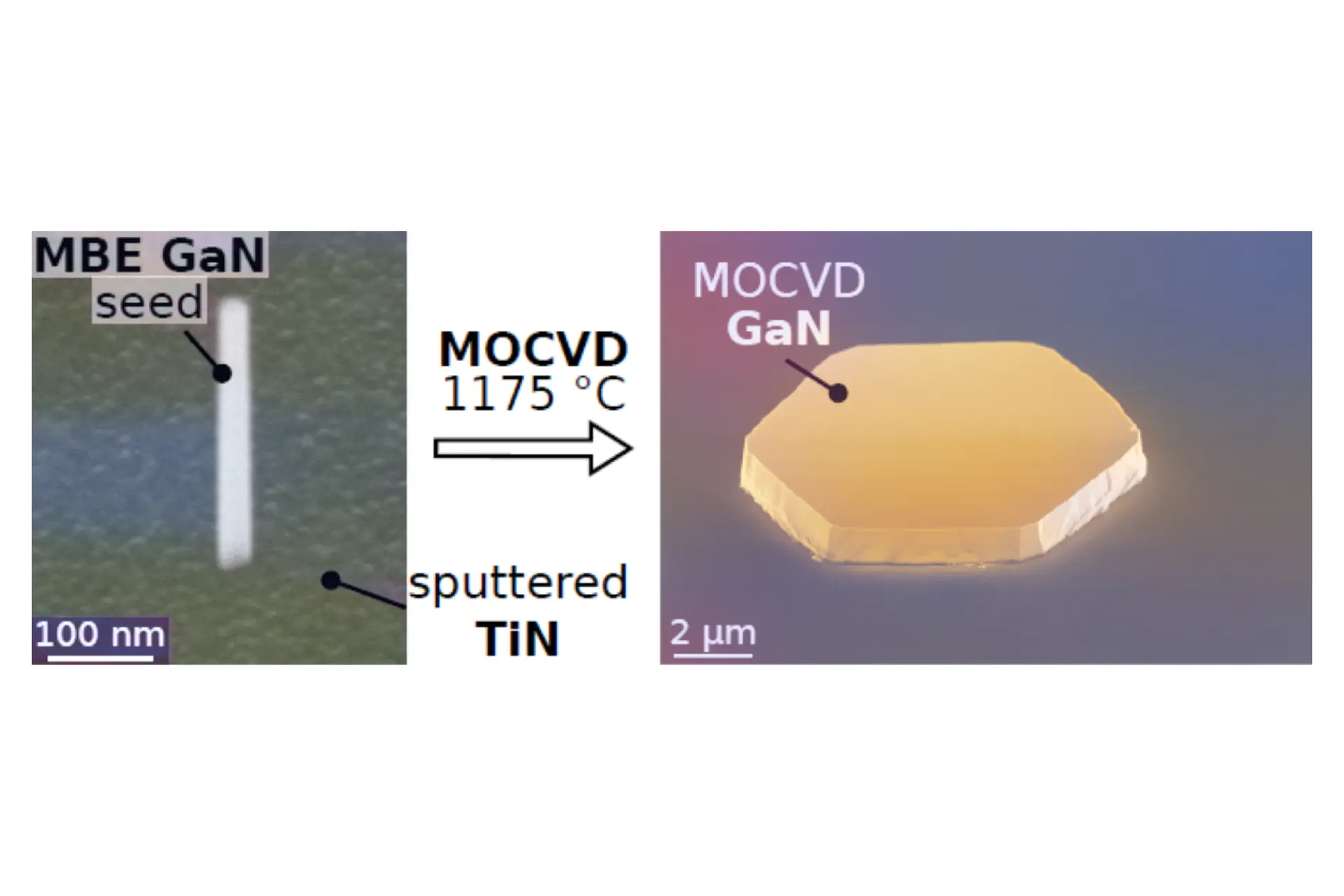 To ensure high crystalline quality despite the chemical and structural differences between metal and semiconductor, the project employs molecular beam epitaxy (MBE) to grow defect-free GaN and AlN seed nanowires on refractory TiN films. Subsequent lateral overgrowth by metal-organic chemical vapor deposition (MOCVD) yields either hexagonally shaped µ-platelets or fully coalesced GaN and AlN layers. Structural and optical investigations will reveal the formation of possible defects at the semiconductor–metal interface and provide valuable feedback for optimizing growth conditions and nanowire morphology. In the final phase, the team will explore the integration of this approach on Si substrates, paving the way for scalable, industrially relevant applications.
