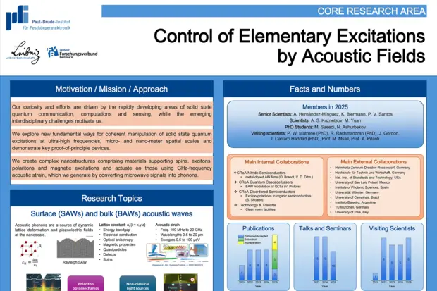 In this CReA, we investigate how elastic vibrations, specifically surface acoustic waves (SAWs) and bulk acoustic waves (BAWs), can manipulate elementary excitations at the nanoscale. Using high-quality materials and advanced nanofabrication techniques, we design structures that efficiently couple to dynamic strain fields. By employing piezoelectric transducers, we generate acoustic waves at frequencies up to 20 GHz, enabling control over material excitations in semiconductor and magnetic systems. Our research spans applications in telecommunications, quantum information processing, and hybrid acousto-opto-electronic systems.